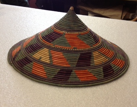 The last object, the colorful, geometric patterned object has another familiar shape. According to our records, it comes from either Rwanda or Burundi in Africa. When the object first entered the Museum’s collection, it was categorized as “a hat.” But with further research, an intern found that it may actually be the lid to a basket. http://www.davidrumsey.com/amica/amico201168-10770.html