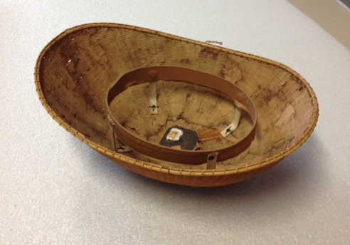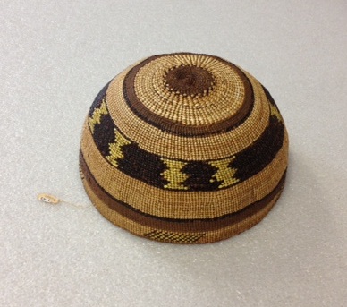 The geometric patterned object, at left and center above, is also a hat. This is a woman’s basketry cap from the Klamath tribe, native to Northern California and Oregon. However, the familiarity of its woven shape can easily be interpreted as either a basket or a hat. http://natural-history.uoregon.edu/collections/web-galleries/klamath-river-basin-basketry-caps