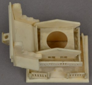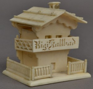 Boston Children’s Museum collects and houses many unique artifacts and specimens from around the world. Sometimes, we find artifacts with hidden unique features. In one of the many shelves in collection’s storage, there sits a Swiss chalet model, measuring roughly 2 inches tall, among a drawer of other Swiss miniatures. On the front of the model, the words “Rigi Kaltbad” are carved. Upon searching “Rigi Kaltbad” online, I learned that it is a historic resort area in the Swiss Alps. This little model, which was donated in 1942, was likely a souvenir novelty acquired on someone’s travels in Switzerland. One of the model’s interesting features includes its roof flipping to the side to uncover an area for an inkwell, but the chimney contains the hidden unique feature.
