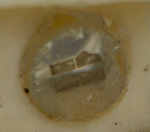 A very small piece of glass is situated in the chimney, and by holding the glass to a light source and then looking into the chimney, it reveals 4 microphotographs! For each image, they measure about 1 millimeter wide, which is about the size of a pencil’s tip. These types of viewing devices are called Stanhopes and were invented by René Dagron around 1857. Stanhopes came in an array of objects from pens, rings, pendants, and many other objects.