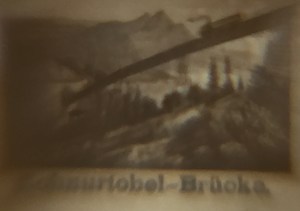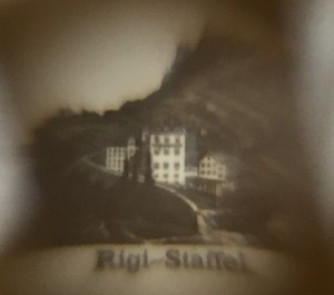 The 4 microphotographs in our object display and label areas of the Swiss Alps including Rigi Kaltbad, Rigi Staffel, Schnurtobel-Brücke, and Rigi Känzli. When searching those labels online, I found similar historic images of these areas from the early 1900s that match the sites and imagery in the microphotographs. I then experimented with trying to capture the 4 photographs. Since the museum does not have a microscope with the ability to take pictures, I went through a trial and error process to find the best way to capture the 4 microphotographs. I attempted different angles and lighting with a macro lens and even the museum’s exhibit microscope component, Scope on a Rope, but unfortunately none of those options worked. Lastly, I decided to try and use my iPhone, and surprisingly, it worked better than the other options! Explore the images and video below as you take a virtual peak at a Stanhope!