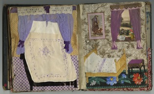 You can also make a scrapbook to be a house for paper dolls. These scrapbooks often start at the front door and then enter into the more public areas of the house like the kitchen and living room. As the pages turn they go on to the more private portions of the house. There are often moveable parts like tissue paper curtains or books. In addition, the maker creates paper dolls to live in the house. The book becomes a plaything.